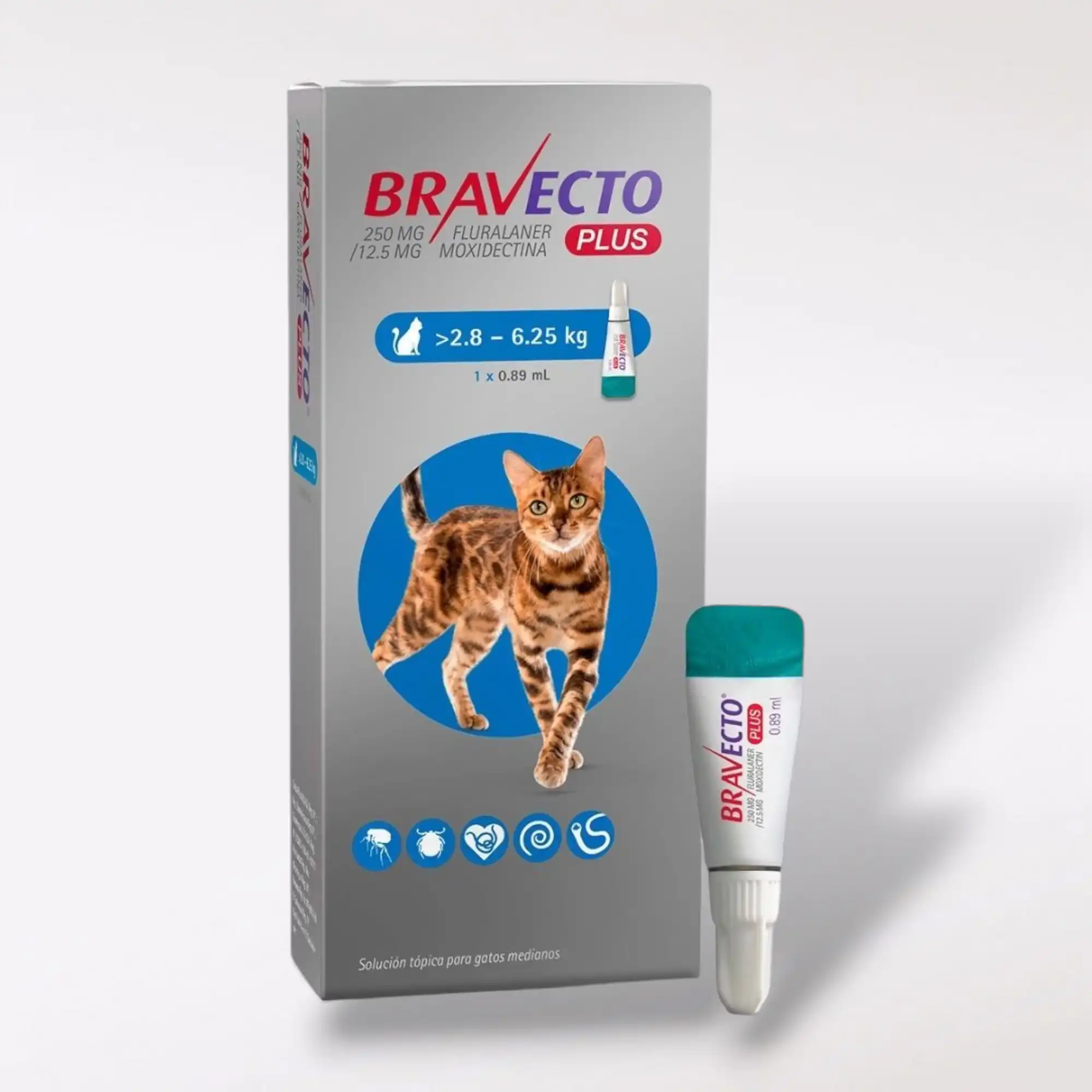 Bravecto Plus Pipeta Desparasitante Externa e Interna para Gato, 250 mg es una solución tópica de fácil aplicación que combate parásitos internos y externos con una sola dosis cada 12 semanas. Su fórmula con Fluralaner (micronizado) elimina el 100% de las pulgas en las primeras 8 horas, controla garrapatas y ácaros, y ofrece una absorción transdermal segura y eficaz. Ideal para gatos de más de 9 semanas de vida y al menos 2.8 kg de peso. Su aplicación es rápida, sin residuos ni olores desagradables, y compatible con rutinas veterinarias de control parasitario.