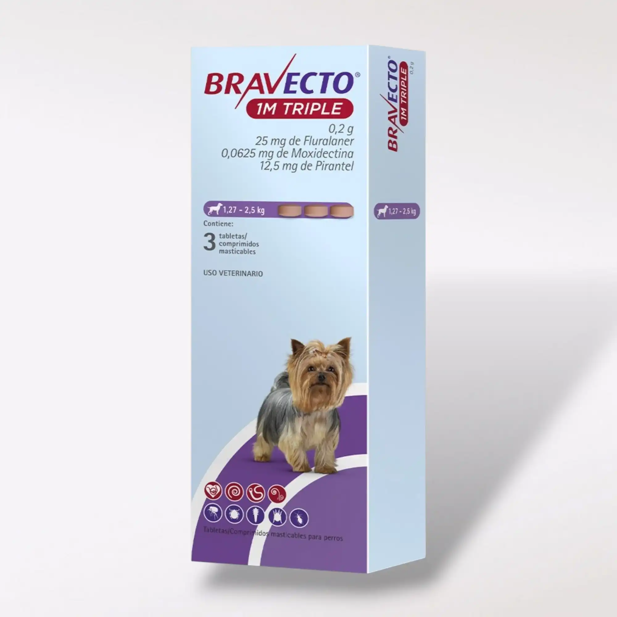 Bravecto Tripack 1M Triple es una solución integral para proteger a tu perro de parásitos internos y externos por 3 meses ya que cuenta con 3 comprimidos a dosificarse uno cada 37 días. Su fórmula avanzada combate infestaciones que afectan desde la piel hasta el sistema digestivo, reduciendo el riesgo de enfermedades graves como la tripanosomiasis y la enfermedad de Chagas.