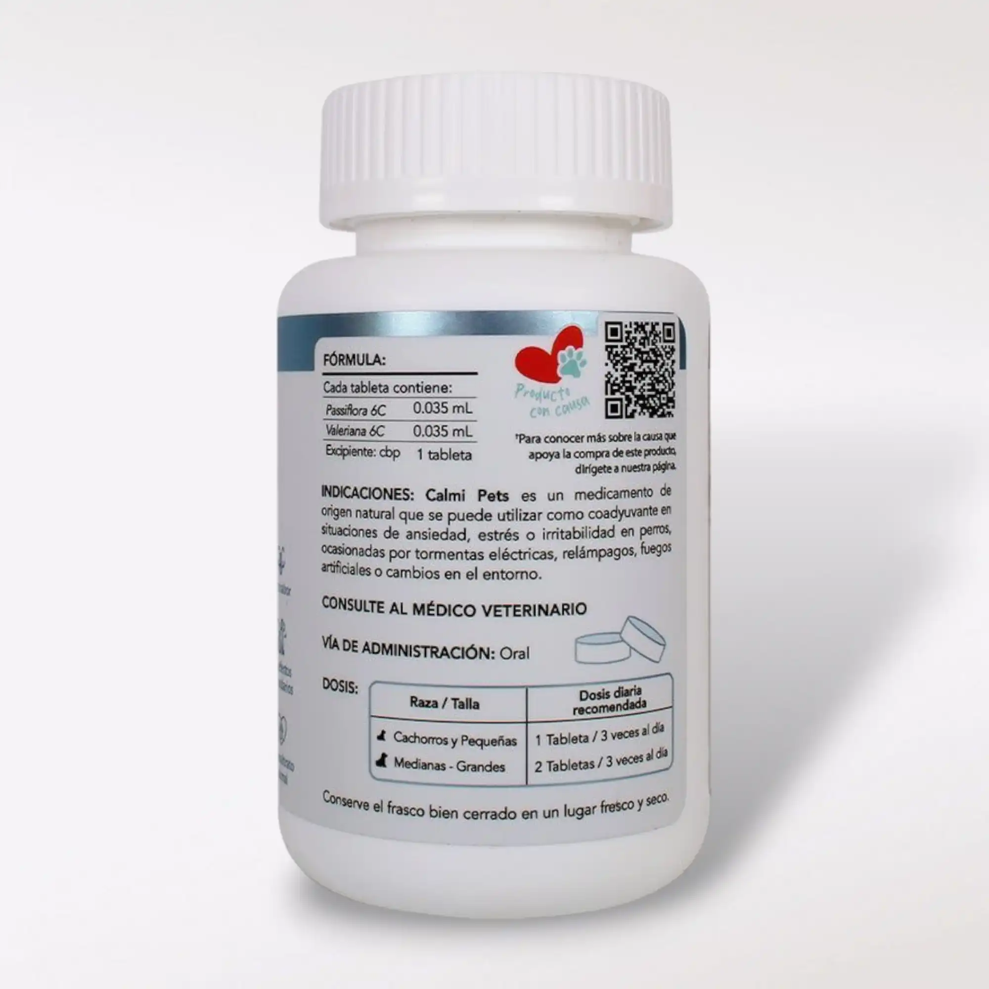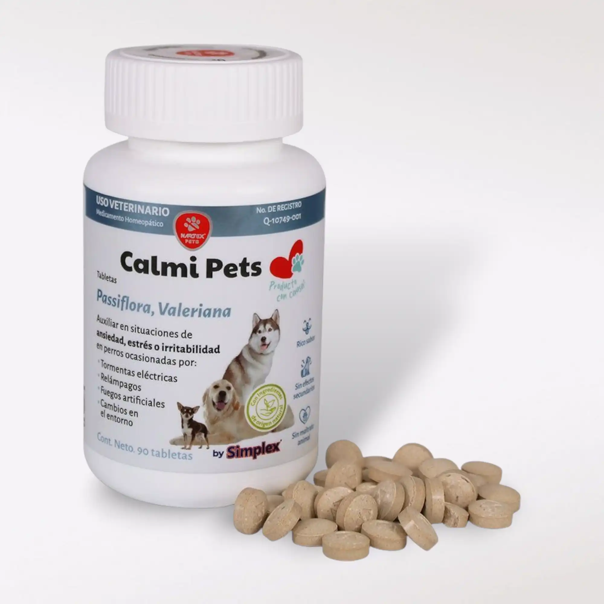 Calmi Pets viene en presentación de 90 tabletas y se administra por vía oral. Puedes ofrecerlas directamente o mezclarlas con el alimento favorito de tu mascota. La dosis recomendada es: