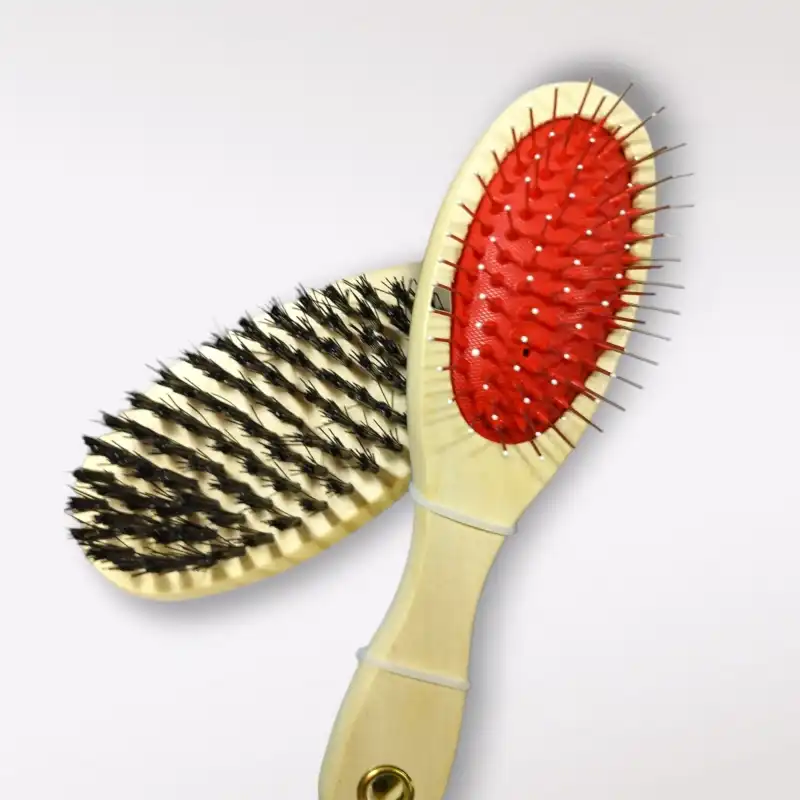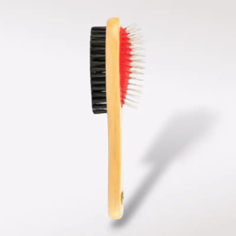 Con dos tipos de cerdas, este cepillo de madera doble cabeza es ideal para mantener la estética y salud de tu mascota. Su diseño funcional permite eliminar de manera efectiva el pelo muerto, asegurando un pelaje saludable y brillante.
