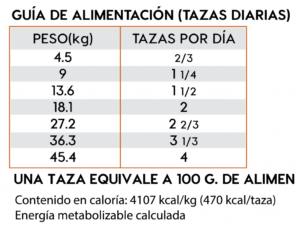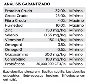 Ingredientes: Harina de pollo, pollo, arroz blanco molido, grasa de pollo (preservada con tocoferoles mixtos), cebada perlada quebrada, producto de huevo de gallina, celulosa en polvo, linaza, pulpa de remolacha deshidratada, saborizante natural (pollo), cloruro de potasio, sal, cloruro de colina, raíz de achicoria seca, clorhidrato de glucosamina, L-carnitina, col rizada, semilla de chía, calabaza, arándanos, naranjas, quinoa, kelp desecada, coco, espinaca, zanahorias, papaya, extracto de yucca schidigera, producto de fermentación de Lactobacillus plantarum secos, producto de fermentación de Bacillus subtilis secos, producto de fermentación de Lactobacillus Acidophilus secos, producto de fermentación de Enterococcus faecium secos, producto de fermentación de Bifidobacterium animalis secos, suplemento de vitamina E, beta caroteno, sulfato de condroitina, proteinato de hierro, proteinato de zinc, proteinato de cobre, sulfato ferroso, sulfato de zinc, sulfato de cobre, yoduro de potasio, mononitrato de tiamina (vitamina B1), proteinato de manganeso, oxido de manganeso, acido ascórbico, suplemento de vitamina A, biotina, niacina, pantotenato de calcio, sulfato de manganeso, selenito de sodio, clorhidrato de piridoxina (vitamina B6), suplemento de vitamina B12, riboGavina (vitamina B2), suplemento de vitamina D, acido fólico.