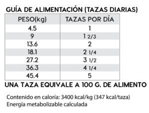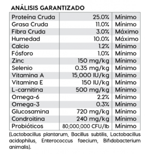 Ingredientes: Carne de pollo, harina de carne de pollo, granos enteros de arroz integral, arroz blanco molido, producto de huevo (gallina), avena, salvado de arroz, pulpa de remolacha deshidratada, grasa de pollo (preservada con tocoferoles mixtos), sabor natural (pollo), linaza, cloruro de potasio, DL- metionina, cloruro de colina, taurina, clorhidrato de glucosamina, raíz de achicoria seca, L-Carnitina, col rizada, semilla de chía, calabaza, arándanos, naranjas, quinoa, kelp desecada, coco, espinaca, zanahorias, papaya, extracto de yucca schidigera, producto de fermentación de Lactobacillus plantarum secos, producto de fermentación de Bacillus subtilis secos, producto de fermentación de Lactobacillus acidophilus secos, producto de fermentación de Enterococcus faecium secos, producto de fermentación de Bifidobacterium animalis secos, suplemento de vitamina E, beta caroteno, sulfato de condroitina, proteinato de hierro, proteinato de zinc, proteinato de cobre, sulfato ferroso, sulfato de zinc, sulfato de cobre, yoduro de potasio, mononitrato de tiamina, proteinato de manganeso, óxido de manganeso, ácido ascórbico, suplemento de vitamina A, biotina, niacina, pantotenato de calcio, sulfato de manganeso, selenito de sodio, clorhidrato de piridoxina, suplemento de vitamina B12, riboGavina, suplemento de vitamina D, ácido fólico.