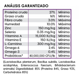 Ingredientes: Carne De Pollo, Harina De Carne De Pollo, Cebada Perlada Quebrada, Arroz Blanco Molido, Grano De Sorgo, Grasa De Pollo (Preservada Con Tocoferoles Mixtos), Pulpa De Remolacha Deshidratada, Producto De Huevo (Gallina), Linaza, Sabor Natural (Pollo), Cloruro De Potasio, Sal, Cloruro De Colina, Raíz De Achicoria Seca, L-Carnitina, Col Rizada, Semilla De Chía, Calabaza, Arándanos, Naranjas, Quinoa, Kelp Desecada, Coco, Espinaca, Zanahorias, Papaya, Extracto De Yucca Schidigera, Producto De Fermentación De Lactobacillus Plantarum Secos, Producto De Fermentación De Bacillus Subtilis Secos, Producto De Fermentación De Lactobacillus Acidophilus Secos, Producto De Fermentación De Enterococcus Faecium Secos, Producto De Fermentación De Bifidobacterium Animalis Secos, Suplemento De Vitamina E, Beta Caroteno, Proteinato De Hierro, Proteinato De Zinc, Proteinato De Cobre, Sulfato Ferroso, Sulfato De Zinc, Sulfato De Cobre, Yoduro De Potasio, Mononitrato De Tiamina, Proteinato De Manganeso, Oxido De Manganeso, Ácido Ascórbico, Suplemento De Vitamina A, Biotina, Niacina, Pantotenato De Calcio, Sulfato De Manganeso, Selenito De Sodio, Clorhidrato De Piridoxina, Suplemento De Vitamina B12, RiboGavina, Suplemento De Vitamina D, Ácido Fólico.