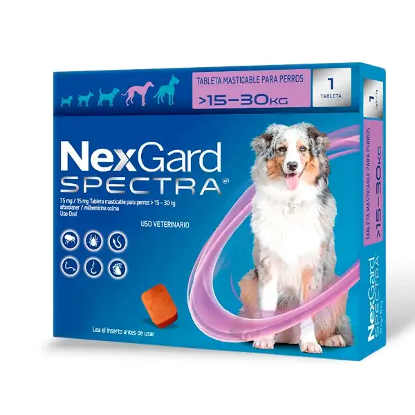 NexGard Spectra es una tableta masticable de uso veterinario que brinda protección interna y externa completa en perros grandes de 15 a 30 kg, desde las 8 semanas de edad. Con una sola dosis mensual, ayuda a proteger a tu perro contra los parásitos más comunes de manera práctica, segura y confiable.