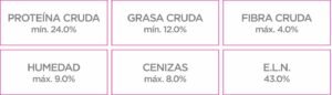 Harina de carne de res, arroz, maíz, carne de pollo, concentrado de proteína vegetal, grasa de pollo, harina de carne de pollo, pulpa de remolacha, semilla de linaza, harina de pescado, sabor natural de pollo, fósforo, calcio, sodio, extracto de raíz de achicoria, cloruro de colina, levadura hidrolizada (Saccharomyces cerevisiae activa 10×1010 ), acetato de retinol (fuente de vitamina A), colecalciferol (fuente de vitamina D), acetato de DL- alpha tocoferol (fuente de vitamina E), menadiona nicotinamida bisulfato (fuente de vitamina K), ácido ascórbico (fuente de vitamina C), mononitrato de tiamina (fuente de vitamina B1), riboflavina (fuente de vitamina B2), ácido nicotínico (fuente de vitamina B3), clorhidrato de piridoxina (fuente de vitamina B6), cianocobalamina (fuente de vitamina B12), D-biotina (fuente de vitamina H), D-pantotenato de calcio (fuente de vitamina B5), ácido fólico, hierro orgánico, manganeso orgánico, selenio orgánico, cobre orgánico, zinc orgánico, EDDI, extracto de Yucca schidigera, mezcla de romero y tocoferoles como conservadores.