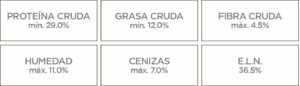 Harina de carne de res, maíz, arroz, carne de pollo, grasa de pollo, harina de pescado, pulpa de remolacha, concentrado de proteína vegetal, sabor natural de pollo, fósforo, calcio, sodio, acetato de retinol (fuente de vitamina A), colecalciferol (fuente de vitamina D), acetato de DL- alpha tocoferol (fuente de vitamina E), menadiona nicotinamida bisulfato (fuente de vitamina K), ácido ascórbico (fuente de vitamina C), mononitrato de tiamina (fuente de vitamina B1), riboflavina (fuente de vitamina B2), ácido nicotínico (fuente de vitamina B3), clorhidrato de piridoxina (fuente de vitamina B6), cianocobalamina (fuente de vitamina B12), D-biotina (fuente de vitamina H), D-pantotenato de calcio (fuente de vitamina B5), ácido fólico, hierro orgánico, manganeso orgánico, selenio orgánico, cobre orgánico, zinc orgánico, EDDI, glucosamina, sulfato de condroitina, extracto de Yucca schidigera, mezcla de romero y tocoferoles como conservadores.