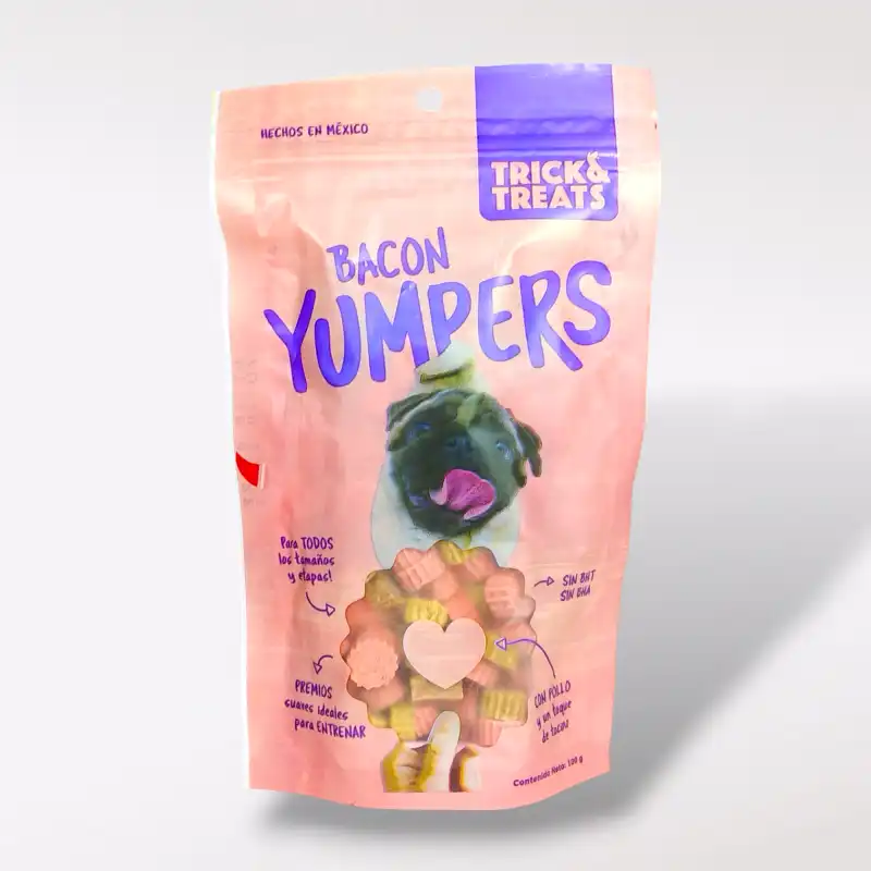 Yumpers sabe a pollo con un toque de tocino. También puedes encontrarlo en sabor pollo y res.