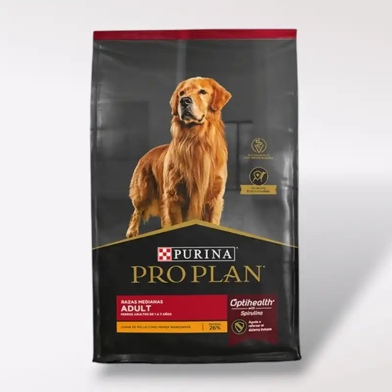 Pro Plan Optihealth Adulto Raza Mediana provee nutrición de avanzada que ayuda a los perros de razas medianas de 1 a 7 años de edad a mantenerse fuertes y llenos de vitalidad.