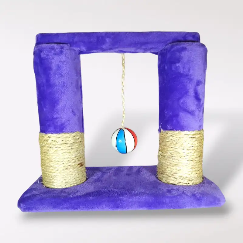 Este estético y divertido rascador tipo arco, diseñado especialmente para que tu gatito pueda jugar y relajarse mientras entretiene sus garritas lejos de tus sillones y otros muebles. Fabricado con materiales como madera, esponja, henequén y tela polar suave, este rascador no solo es resistente, sino que también es un atractivo complemento para tu hogar. El color morado vibrante añade un toque de estilo, mientras que la pelotita colgante satisface el instinto natural de cazar de tu felino. Con unas medidas de 33x40x20cm, es el refugio ideal para cualquier gato que necesite entretenimiento y libertad para rasguñar.
