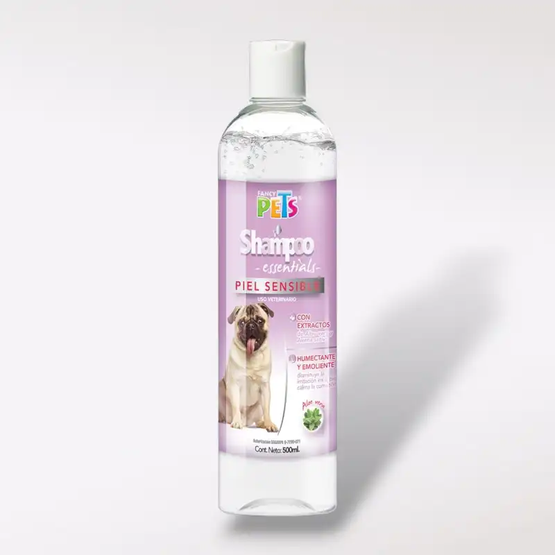 El Shampoo Essentials Piel Sensible de Fancy Pets está formulado con extractos de aloe vera y avena sativa que cuidan y protegen la piel y el pelaje; además contiene pantenol, glicerina y aceite graso para aumentar el brillo y suavidad. No irrita losojos del perro.