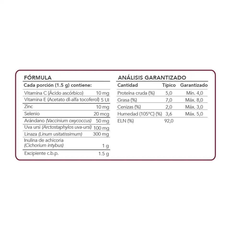 Fortalece el sistema inmunológico, mejora la digestión y previene infecciones urinarias. Es un suplemento integral para el bienestar de tu mascota.