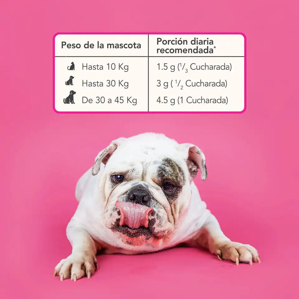 Vitamin Pets incluye una cuchara dosificadora para facilitar su uso diario. Solo necesitas mezclar la porción recomendada con el alimento habitual de tu mascota:
